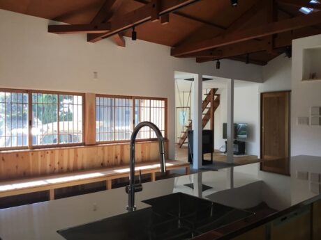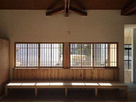 天井を取り払い、既存の木造トラスを生かした高い天井、空間の広さを生かしたオープンキッチン、そして、南からの光が降り注ぐ格子窓とベンチによって居心地のよさを取り戻しました。